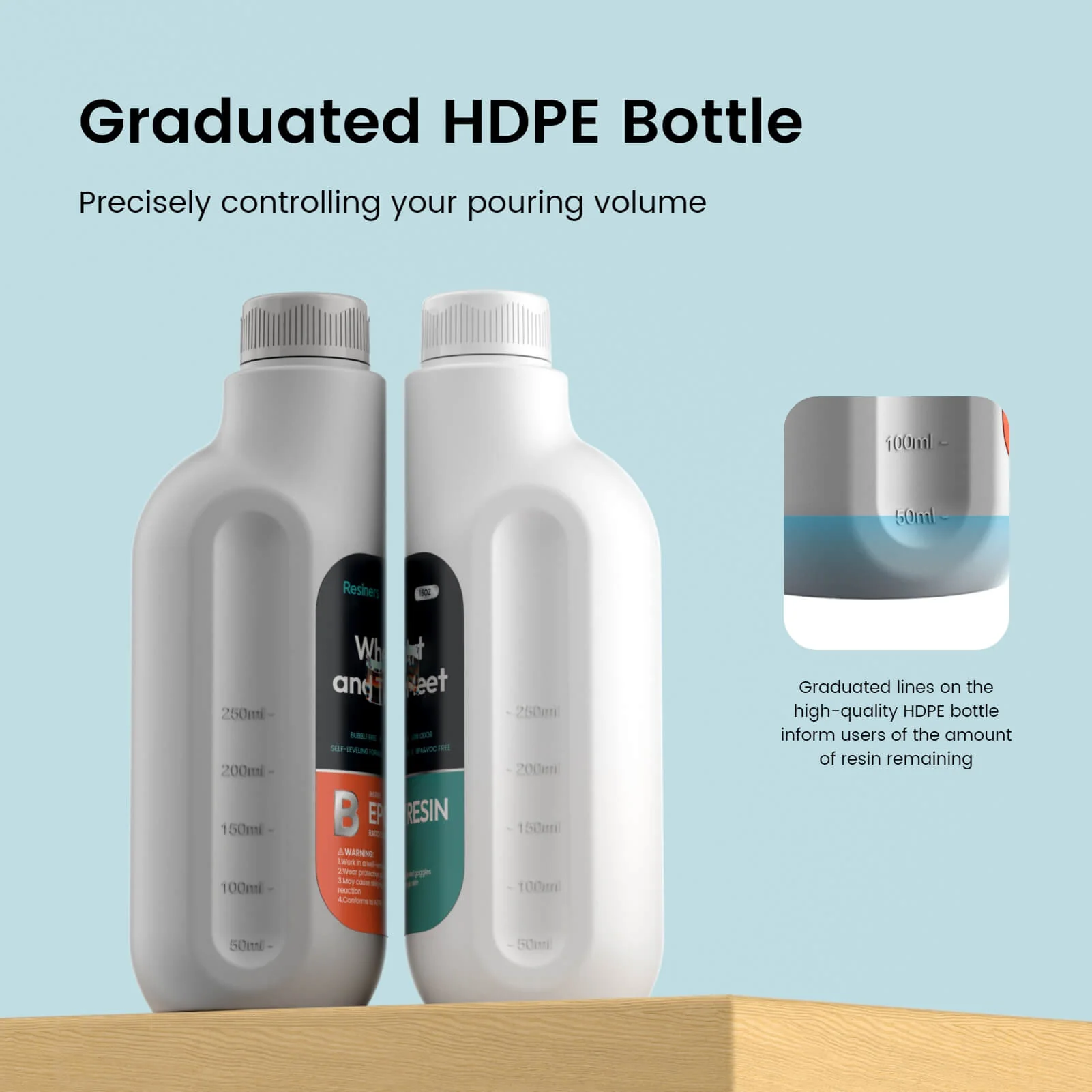 - Graduated HDPE Bottle - Precisely controlling your pouring volume. Graduated lines on the high-quality HDPE bottle inform users of the amount of resin remaining, eliminating doubt as to whether it is enough for their artwork and whether a new bottle is needed. It can also minimize spills for improved pouring perfection.